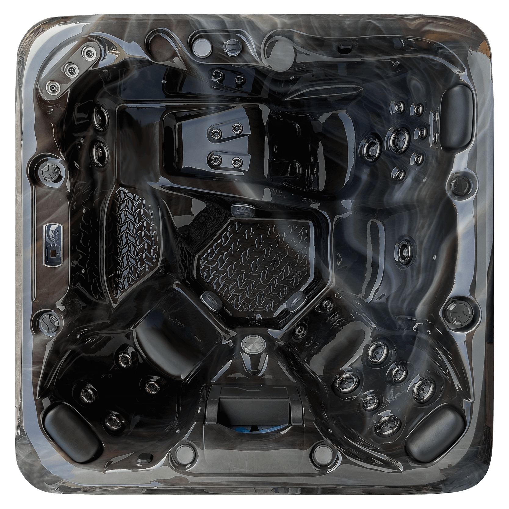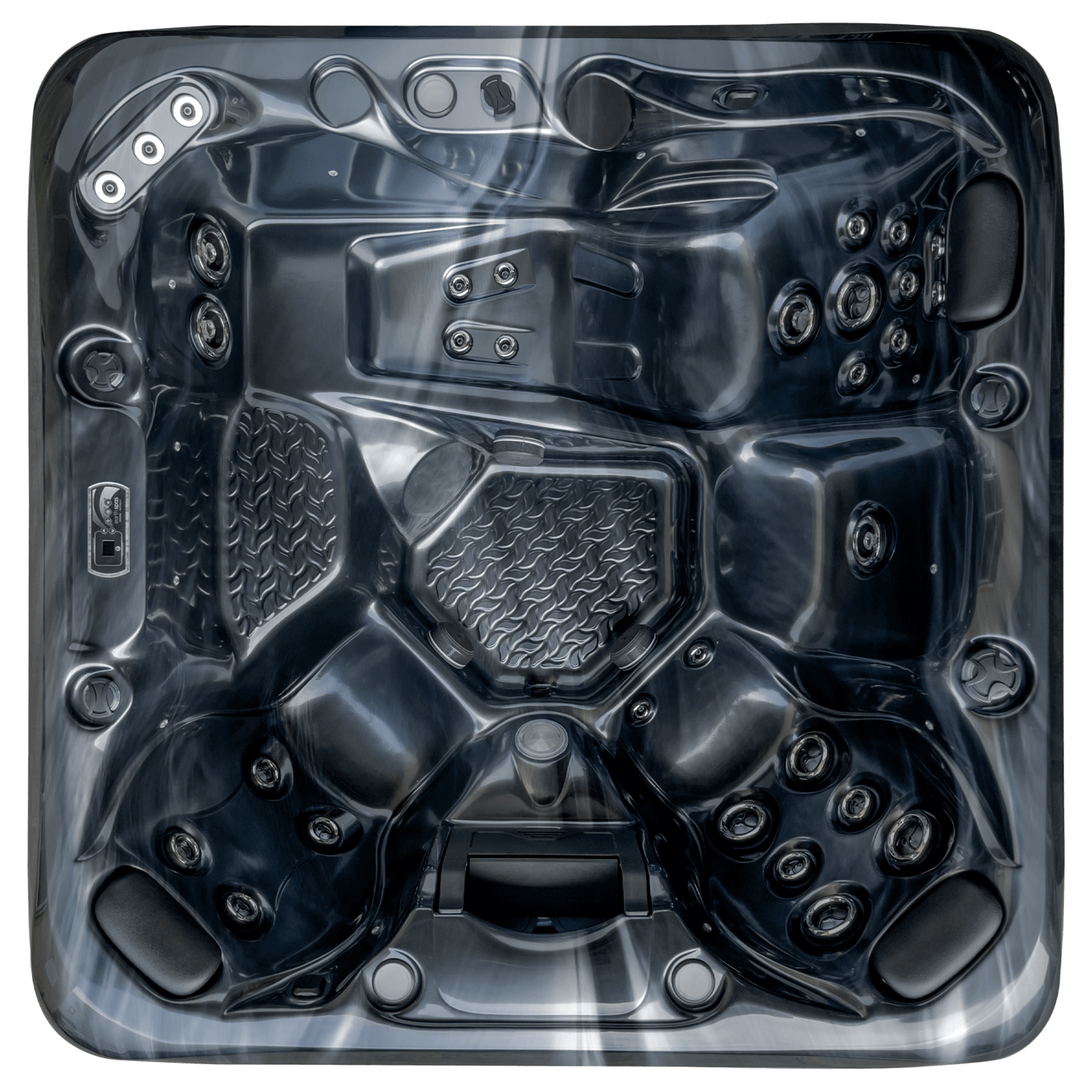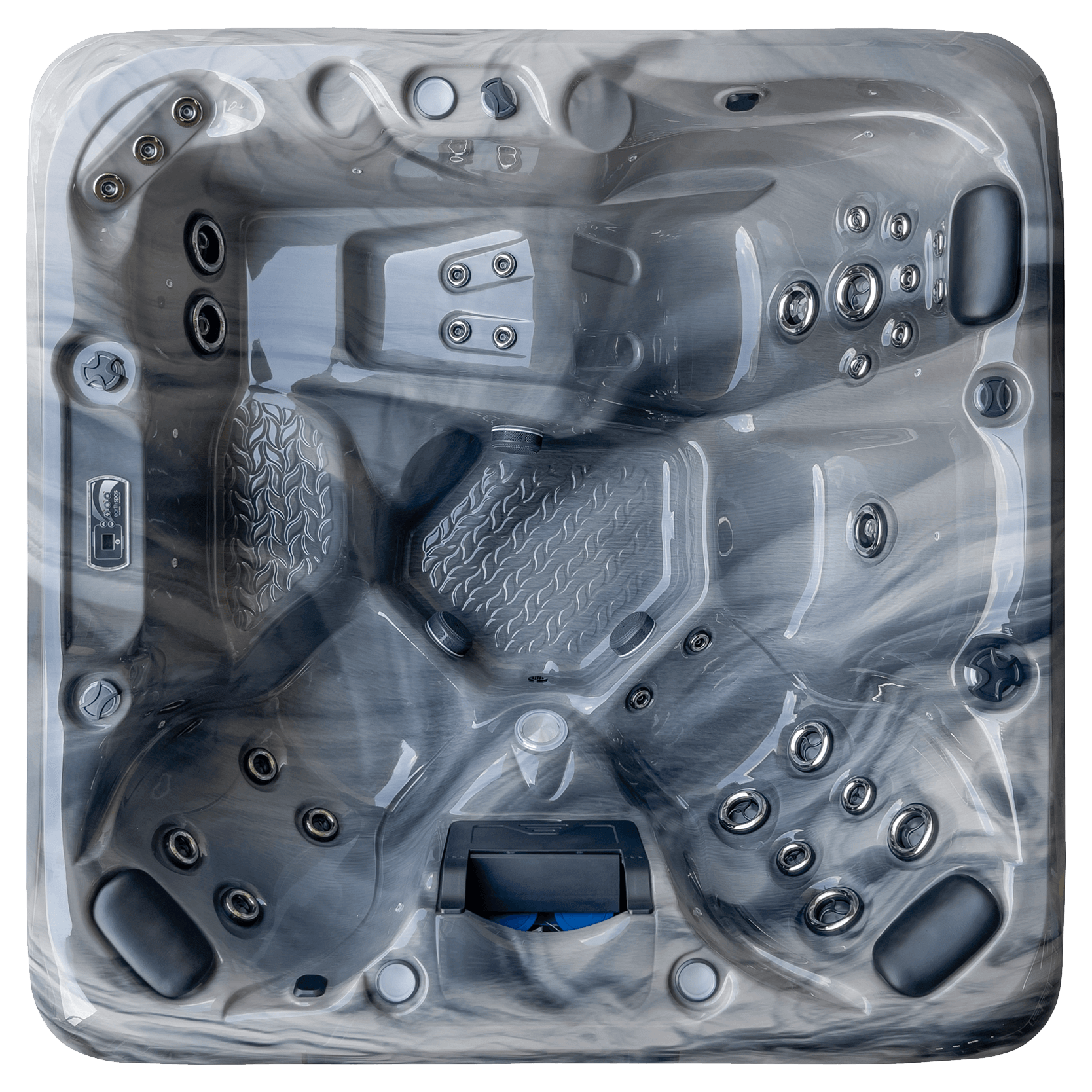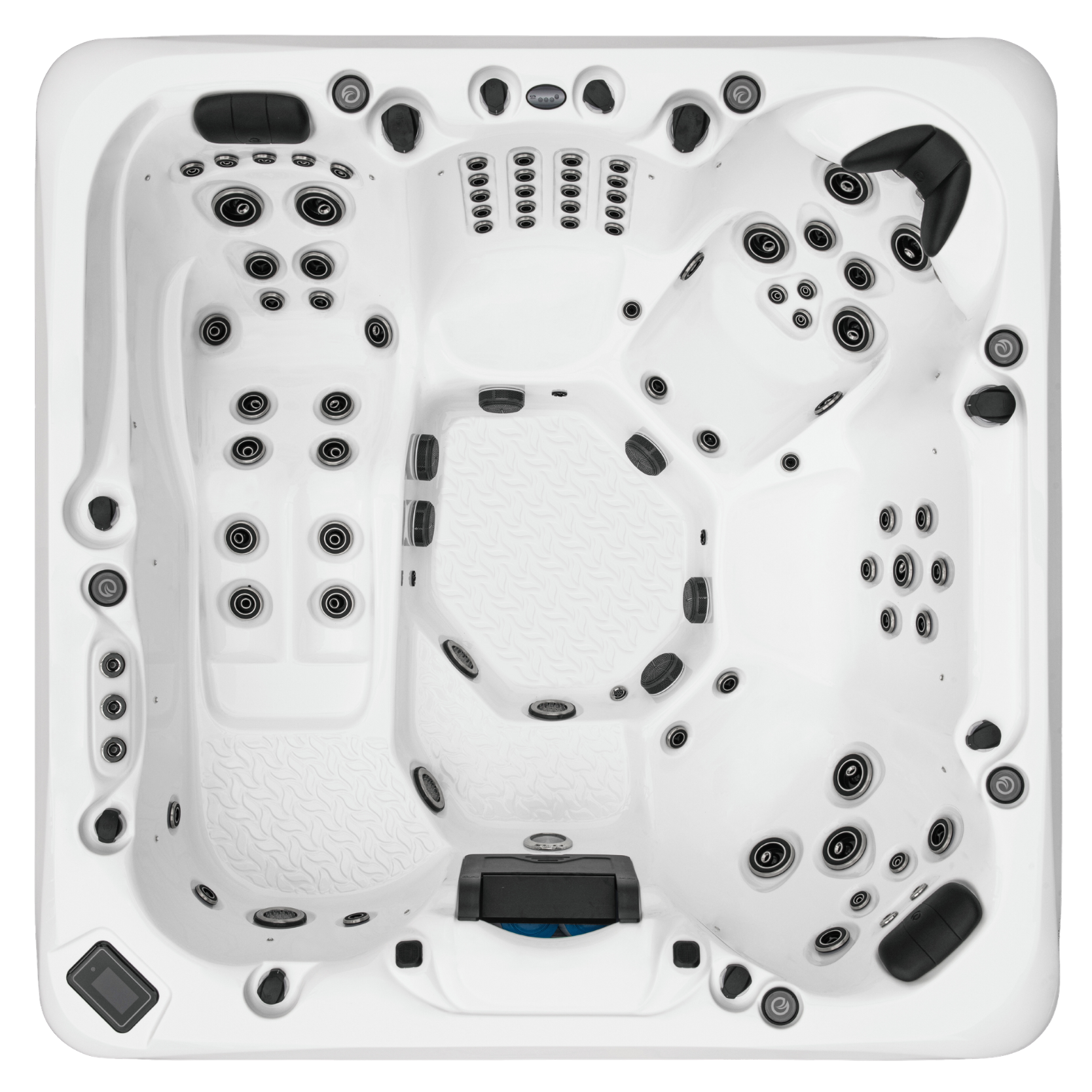The Kern River is a 91" x 91", 90-jet, 3-pump hot tub designed for up to 5–6 adults. It features a single multi-jet lounger alongside multiple seating positions, making it ideal for both relaxation and entertaining.