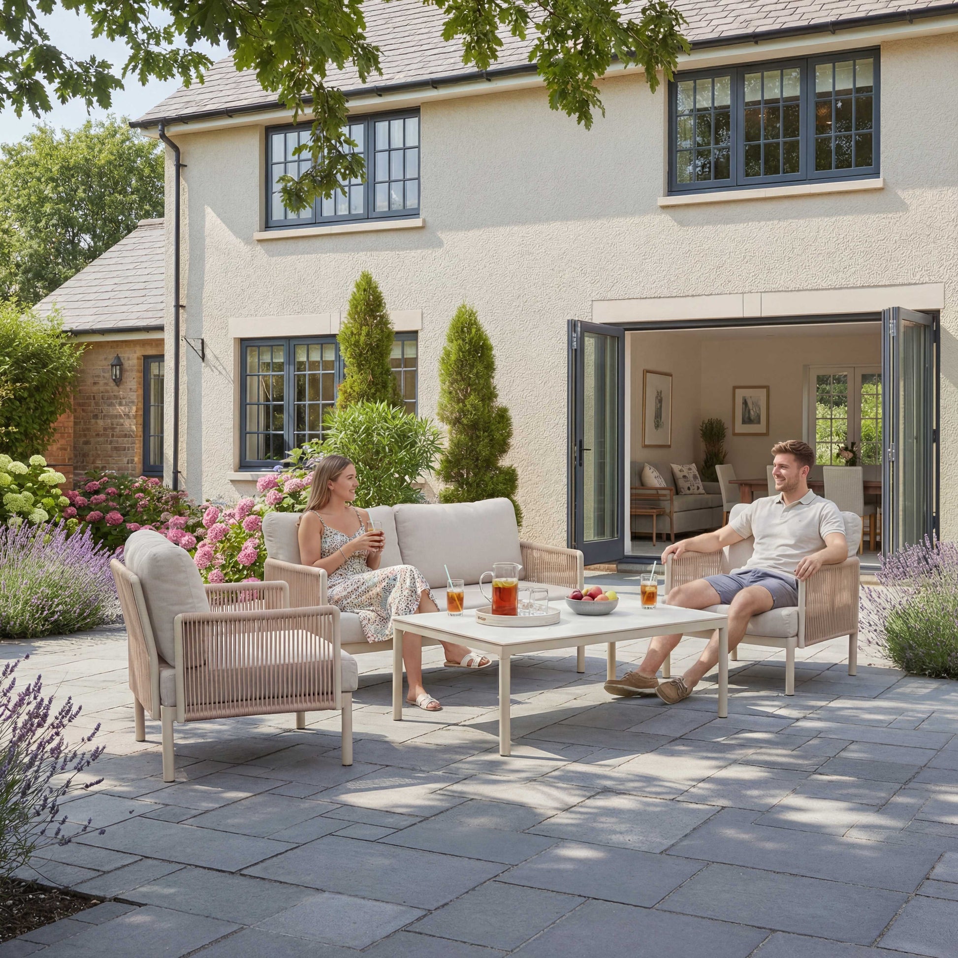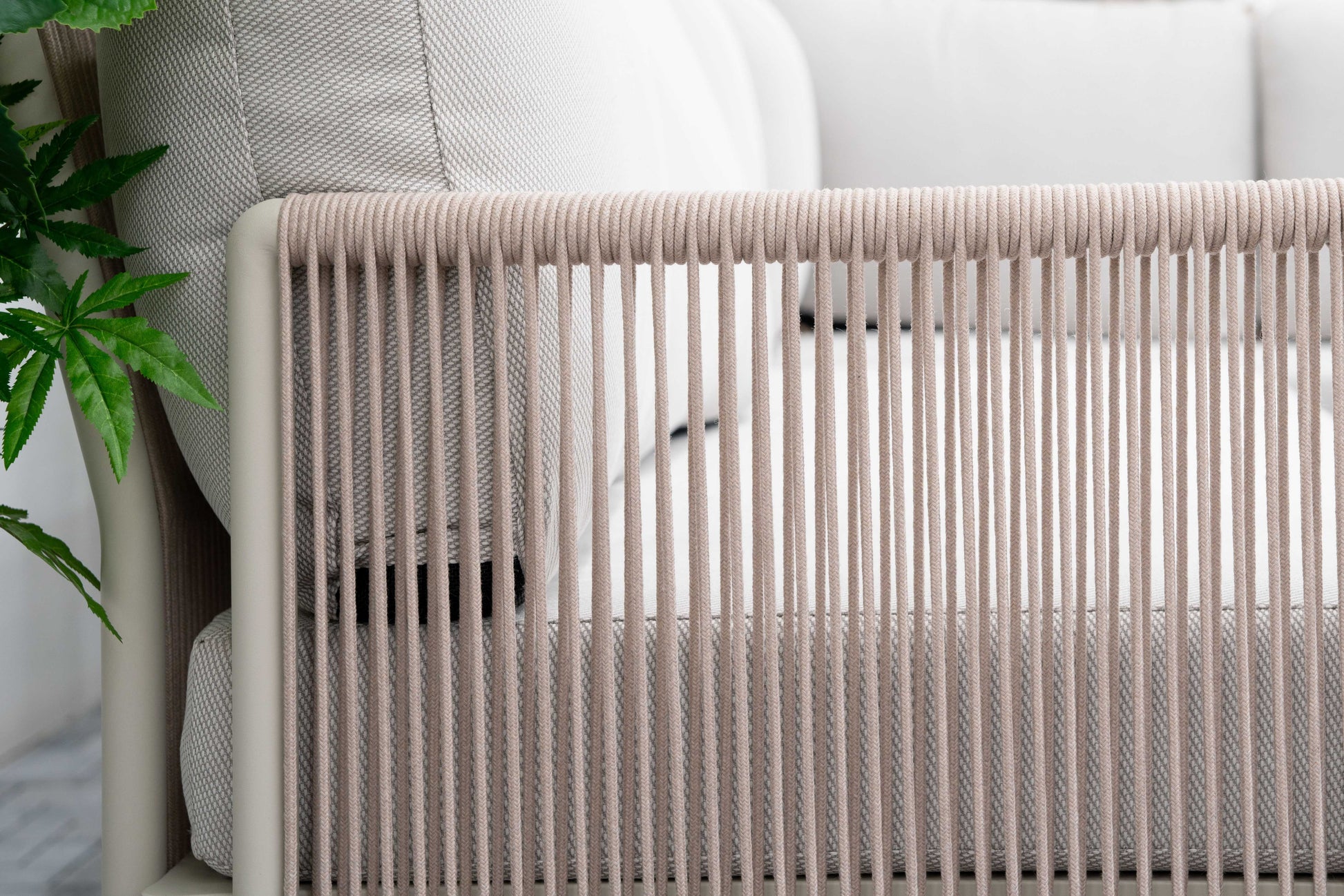 Add a touch of elegance to your outdoor space with the Hayden Collection, a perfect blend of modern design and refined details. Crafted from durable aluminium, the set features a striking pink blush rope design on the back of the chairs, creating a soft and inviting aesthetic. Paired with the muted chalk grey frame, the blush tones form a stunning colour palette that enhances any garden. The sintered stone tabletops are the standout feature of the Hayden Collection. With a luxurious grey marble look, these tabletops bring a premium feel to the set while perfectly complementing its contemporary design. Durable and elegant, they’re ideal for both everyday use and special gatherings. For added functionality, the cushions include button clips to keep them securely attached to the chairs, allowing you to relax in comfort without worrying about slipping cushions. Select sets in the Hayden Collection also include teak accents, introducing a natural element that beautifully ties the design to the garden environment. Aesthetic, durable, and thoughtfully designed, the Hayden Collection is the ultimate choice for creating a stylish and serene outdoor retreat.